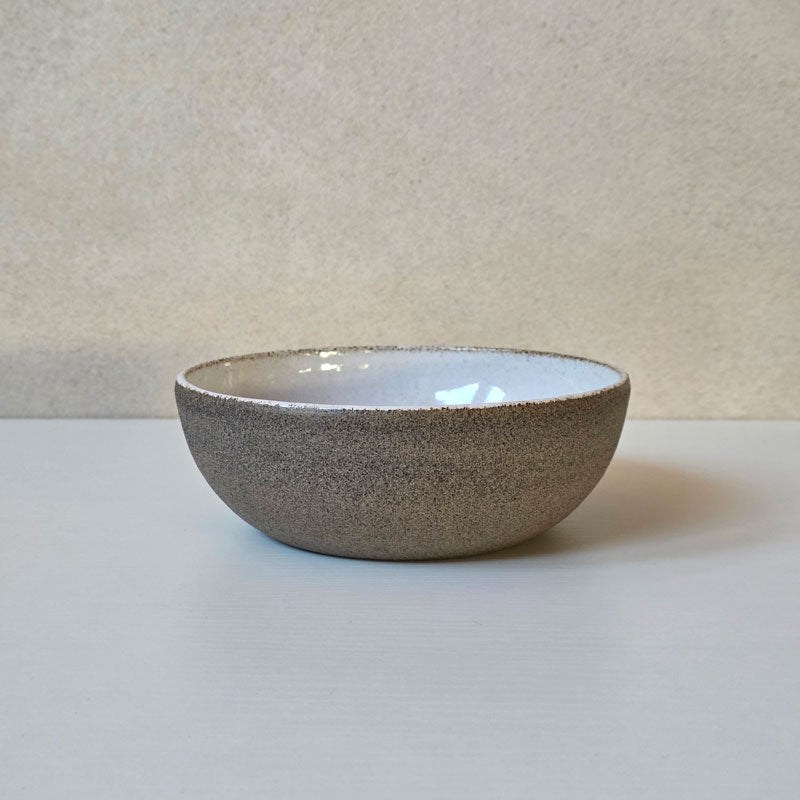 Skålen har en oglaserad utsida och en vit glaserad insida och kant, där leran påverkar och ger den ett ngt brunspräckligt utseende.