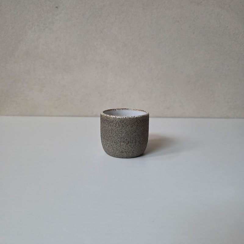 Espressokopp handdrejad i en grov grå stengodslera.