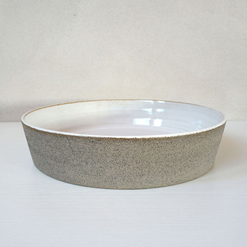 Fatet har en oglaserad utsida och en vit glaserad insida och kant, där leran påverkar och ger den ett ngt brunspräckligt utseende.